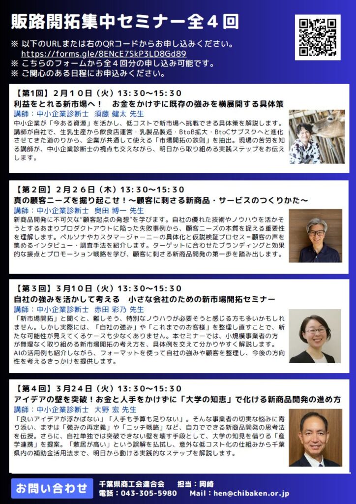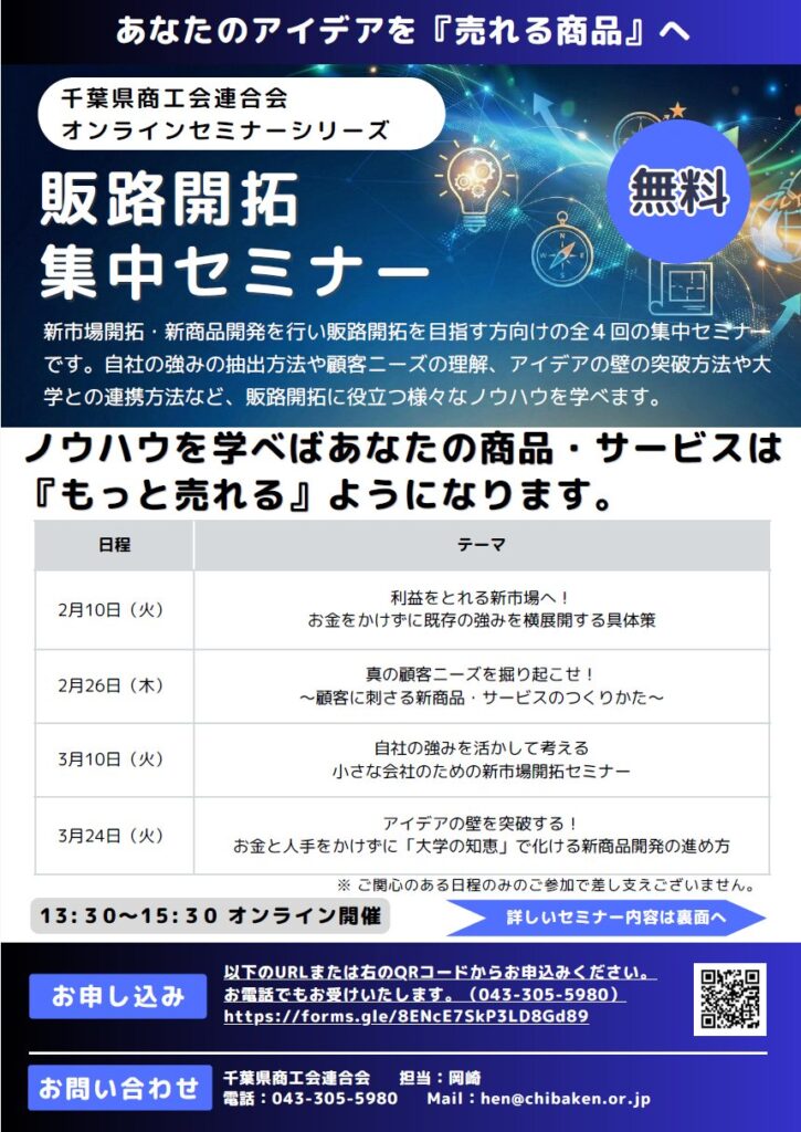 2026年2月、千葉県商工会連合会が主催する販路開拓集中セミナーにおいて、「真の顧客ニーズを掘り起こせ!」をテーマに講師として登壇しました。本セミナーでは、私が企業支援の現場で培ってきた経験をもとに、顧客起点の新商品・サービス開発手法について、体系的かつ実践的に解説しました。